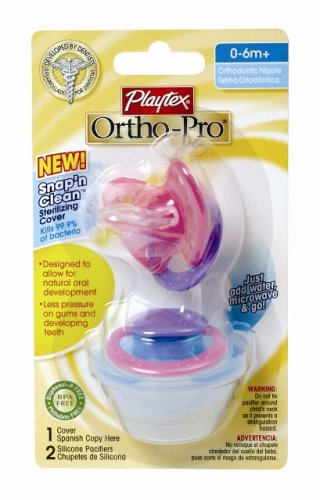 The Playtex Ortho-Pro Silicone Pacifier was specially designed by dentists to not only soothe your baby, but also allow for the natural development of your baby's teeth. The OrthoPro pacifier has an ultra-thin, wavy stem that easily fits between baby's gums and teeth and a unique contoured nipple that reduces pressure by leaving room for the tongue. 0-6+ Months. 2 Pacifiers and 1 Snap 'n Clean Sterilizer Per Package.